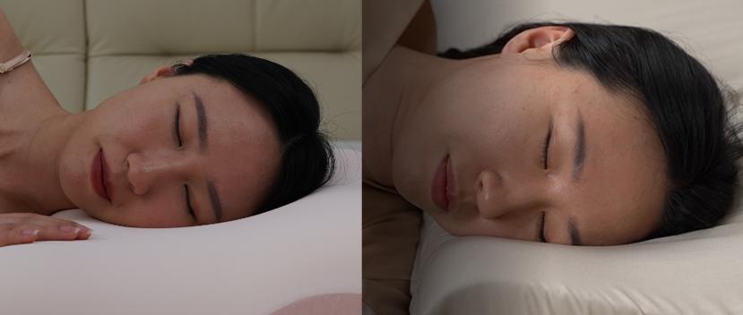 从我试睡的图中可以清楚地看到,左边山茶基枕头侧躺时脸部没有明显的挤压感,而右边普通枕头侧躺时脸部是有明显被挤压的,尤其是嘴角法令纹区域。